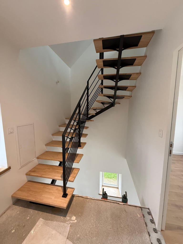 Escalier à limon central : Le favori pour un look moderne et aérien. Une structure unique en acier qui supporte vos marches (bois ou métal) pour une esthétique épurée.