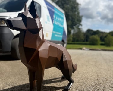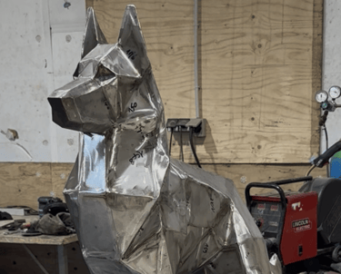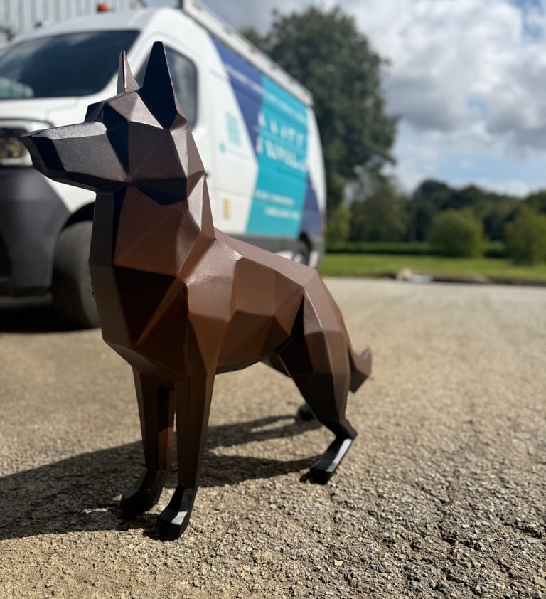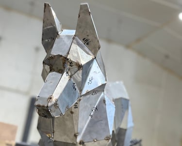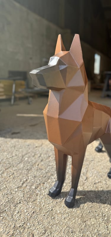La réalisation des sculptures en origami repose sur un processus minutieux et fascinant. Tout d'abord, il s'agit d'un assemblage de nombreuses pièces (146 pour le berger allemand) en inox, qui sont découpées avec précision au laser. Cette technique permet d'obtenir des formes complexes et détaillées, essentielles pour créer des sculptures inspirées de l'art traditionnel de l'origami.