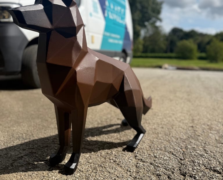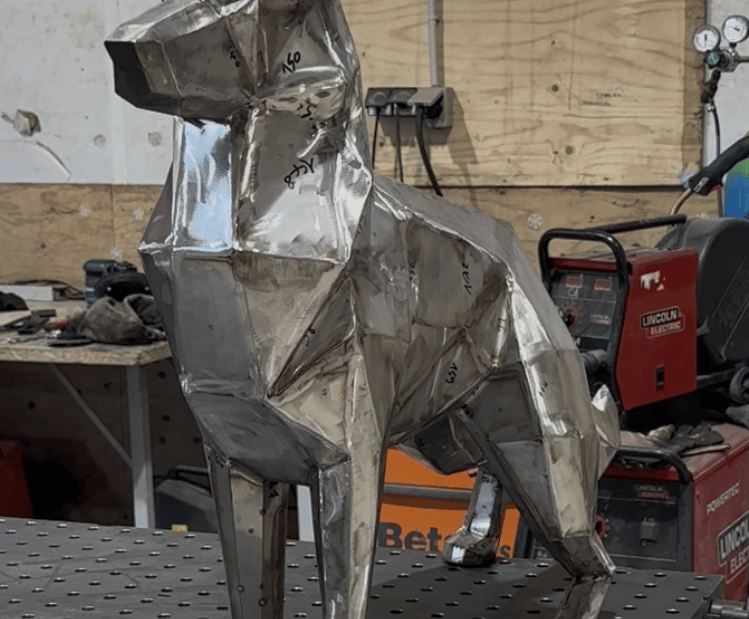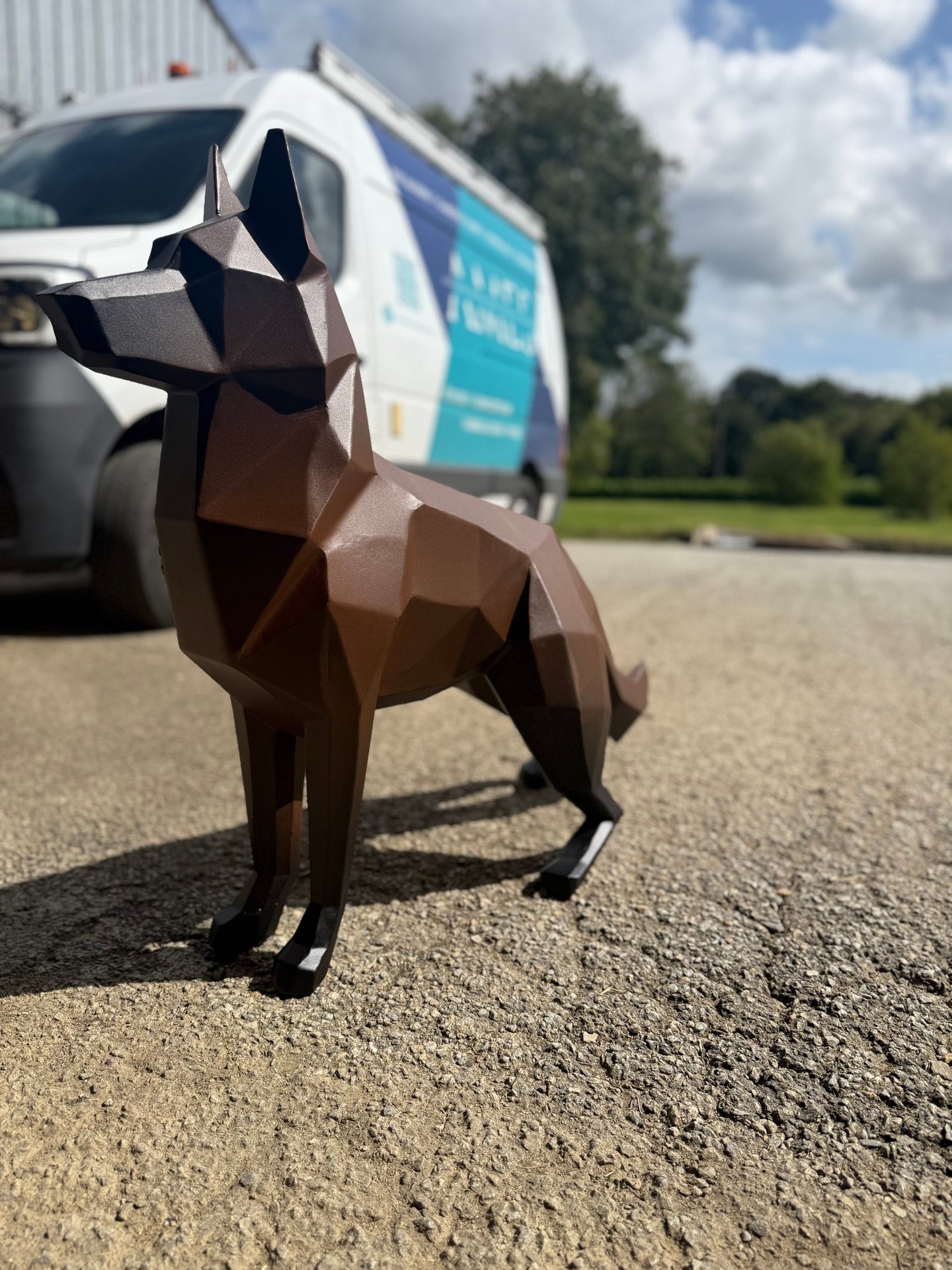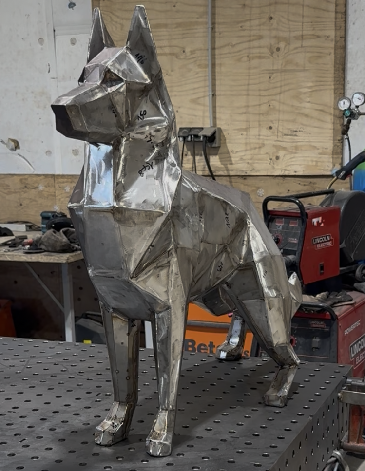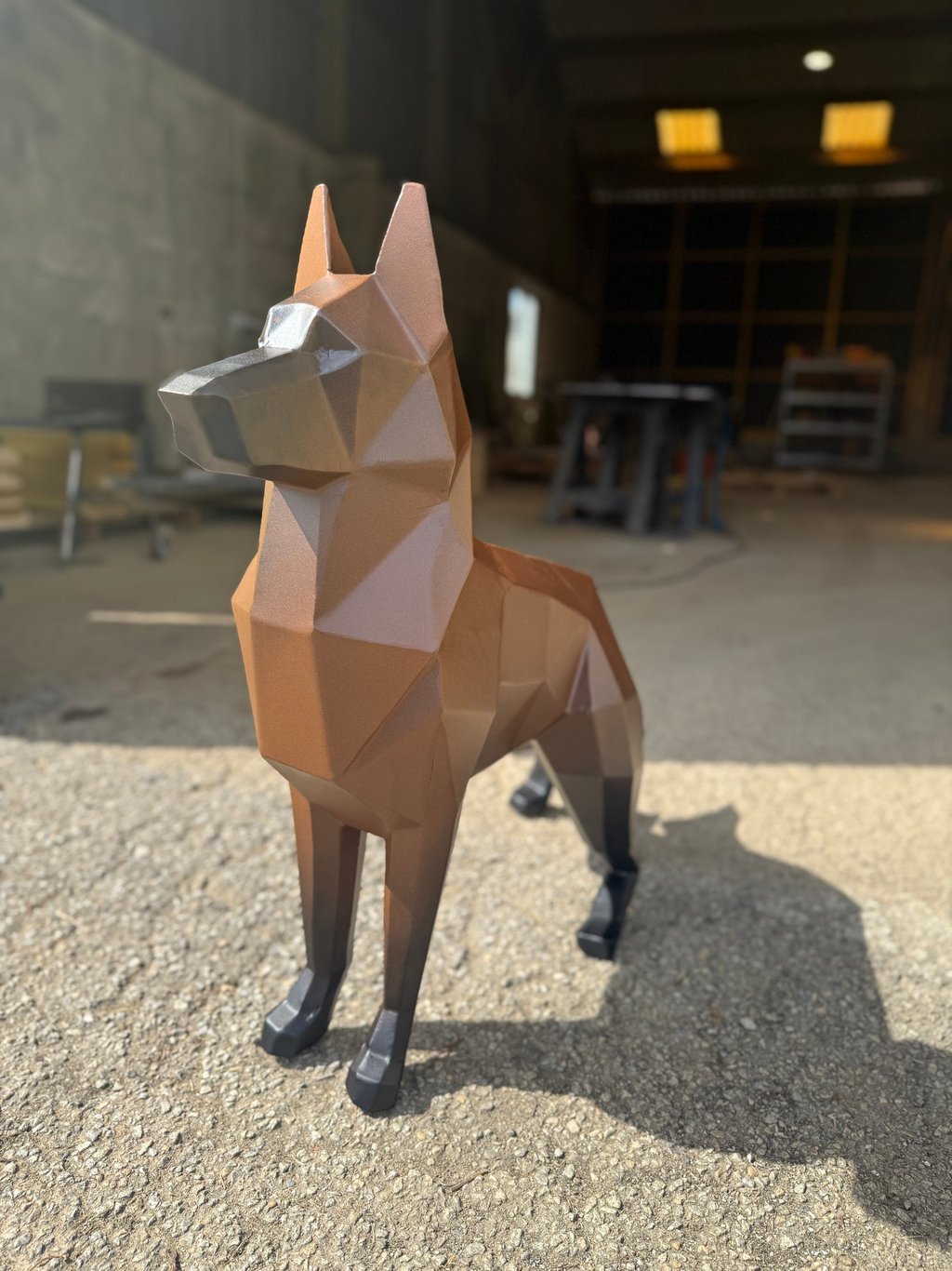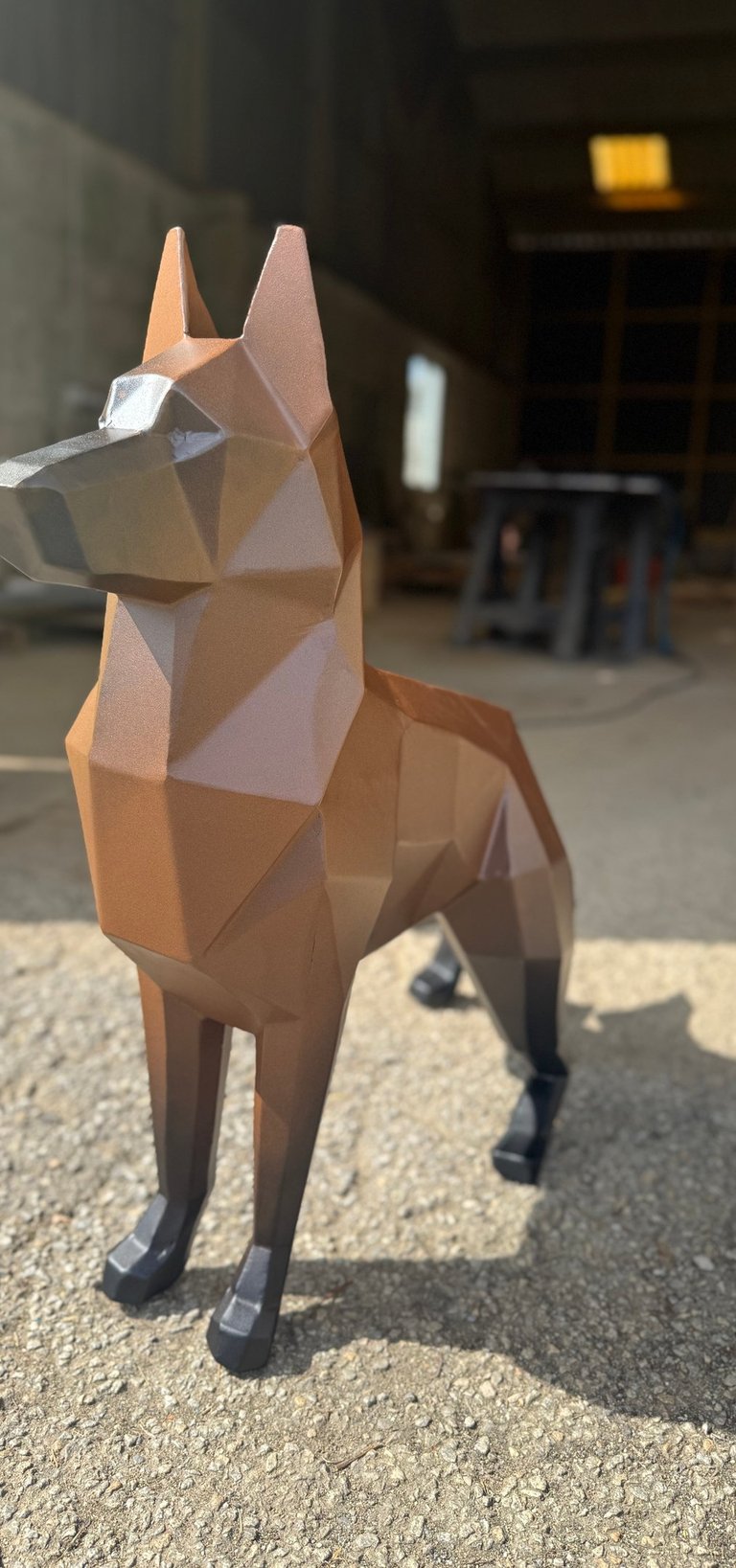 La réalisation des sculptures en origami repose sur un processus minutieux et fascinant. Tout d'abord, il s'agit d'un assemblage de nombreuses pièces (146 pour le berger allemand) en inox, qui sont découpées avec précision au laser. Cette technique permet d'obtenir des formes complexes et détaillées, essentielles pour créer des sculptures inspirées de l'art traditionnel de l'origami.
