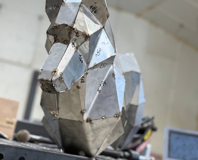 La dernière étape de ce processus consiste en la soudure des pièces. Cette étape est cruciale car elle assure la solidité et la durabilité de la sculpture. Après la soudure, un meulage est effectué pour lisser les joints et donner à l'œuvre une finition impeccable. Le résultat final est une sculpture en inox qui allie modernité et art, captivant par ses formes et ses textures.